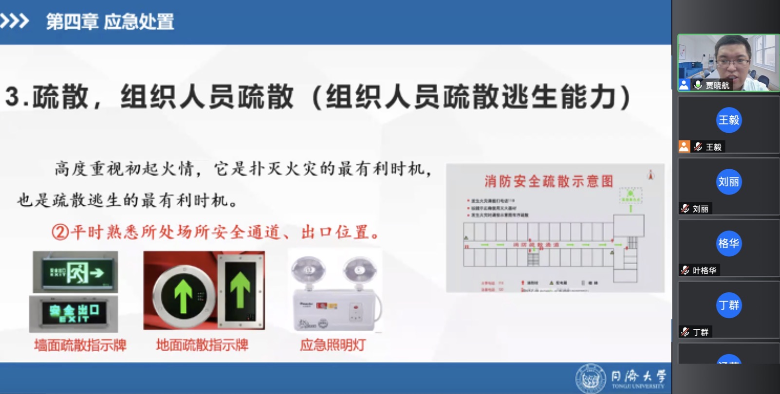 接着,保卫处的贾晓航老师就消防规则、高校火情案例、消防的法律责任、安全生产法、发生火灾时的应急处理和逃生措施各方面为师生作了细致全面的介绍。贾老师总结了近年来高校火灾案例发生的原因,如:宿舍违章电器使用、食堂使用厨具不当、实验室电瓶车用电不慎等,讲解了火情发生时应如何使用灭火设施、如何组织人员疏散等,并提醒师生平时应做一个有心人,记住所在建筑物的灭火器和逃生门位置,有助于在火情发生的第一时间进行疏散。火灾等危害人身安全的风险看似离我们很远,但有时离我们很近,掌握并落实相关防范应对措施是防范风险的要点之一。