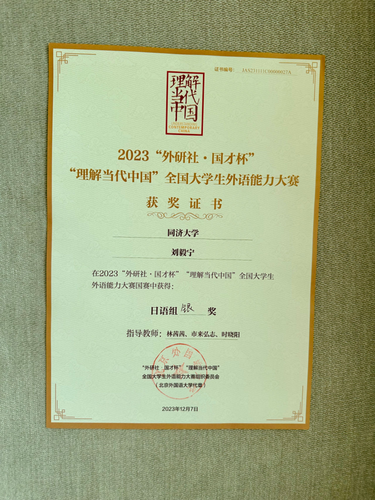 best365中国官方网站日语系2023级研究生刘毅宁从校赛、省赛和国赛第一阶段赛的层层选拔中脱颖而出,最终夺得了总决赛银奖。本次竞赛指导团队主要由日语系林茜茜老师、时晓阳老师、外籍教师市来弘志老师组成,定期展开有针对性的专题辅导。此外,梁艳老师也参与了指导工作。