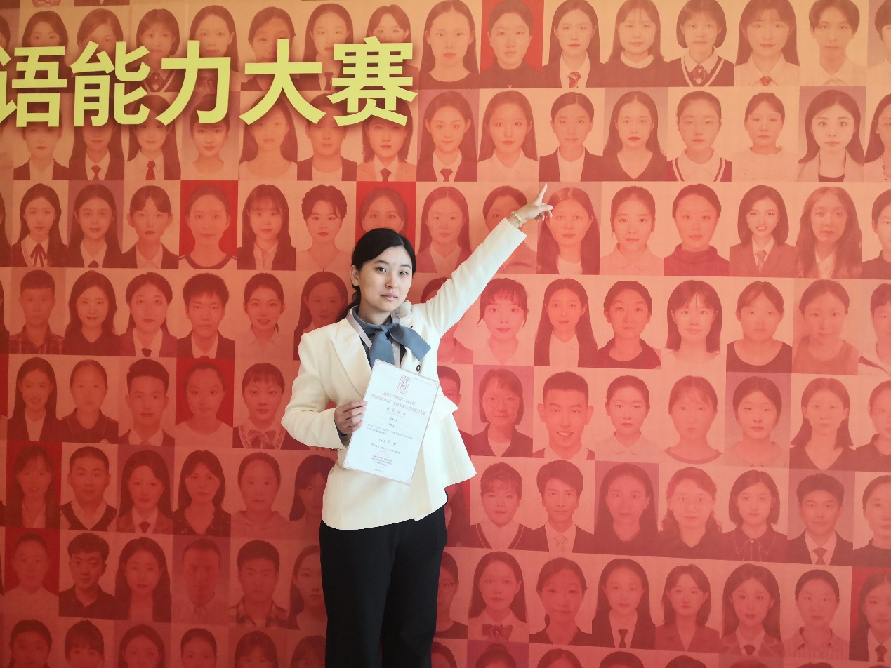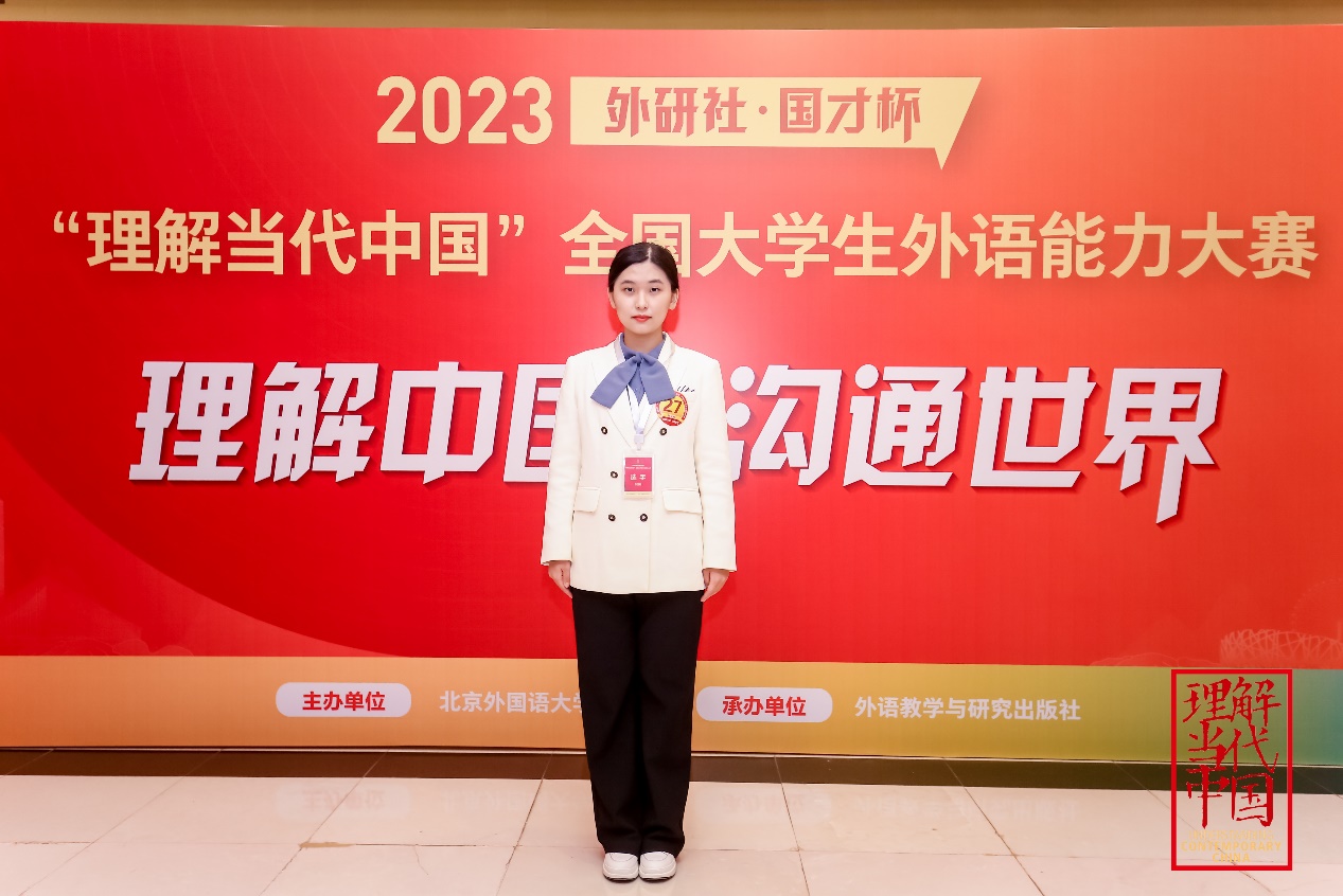 从校赛到省赛再到国赛,最终来到北京、站在全国总决赛的舞台,一路走来我感触良多。首先感谢林茜茜老师、市来弘志老师、时晓阳老师以及梁艳老师,每一次集训前老师们的用心准备、每一次练习后的鼓励、每一场比赛时的陪伴,一幕一幕,我都会铭记于心。正是老师们的鼓励与肯定让我更加的自信!通过本次全国总决赛之旅,我明晰了未来前进的方向。我会继续努力,不断提升自身水平,与时代同向同行,发青春之声,扬奋斗之志,奏强国之音,用日语讲好中国故事。最后,再次感谢所有的指导老师,感谢学校学院的支持!