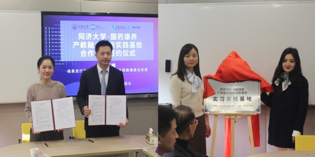 国药康养总经理徐亚峰与学院副经理胡琪代表双方签署基地协议并介绍合作内容,国药康养副总经理柳晓红与学院副书记李疏贝为基地揭牌。