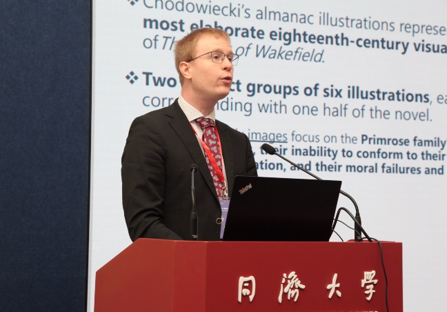 青年领军论坛汇集了四位在世界文学领域有着杰出成就的青年学者,他们分别就自己的研究专长发表了演讲。余静副教授聚焦翻译规范运作的内在机制和译者的风险管理,并以两部违反规范的英文经典中译本为例,研究译者优化翻译决策所考量的几个维度。Russell Palmer副教授整理了十六世纪英国叙事诗《林中小孩》在中国被引入、翻译的历史,并指出考迪克绘本版本的《林中小孩》在中译本读者接受方面的文化传播作用。Kwinten Van De Walle博士的跨媒介研究关注戈德史密斯《威克菲尔德的牧师》的一系列插图,并通过追踪该作品的跨国之旅,发现书籍插图对该小说跨文化传播的重要作用。庞文薇副教授分析了德国著名思想家赫尔德为“人民(volk)”一词赋予的平民、民族和人类三层不同含义,并剖析了三种含义之间以“民歌”为转化媒介的相互关系。