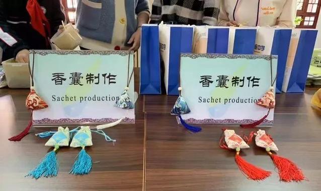 香囊又名香袋、花囊。有用五色丝线缠成的,它是用彩色丝线在彩绸上绣制出各种内涵古老神奇、博大精深的图案纹饰,缝制成形状各异、大小不等的小绣囊,内装多种浓烈芳香气味的中草药研制的细末。古代的香囊是用来提神的,也有用香料来做的,因其香适合很多人的喜欢,后逐步改为纯香料。同济外语人们今天制作的香囊便是中草药香囊,包含防风,丁香,白芷,陈皮等中草药成分。香囊的功效也多种多样,有预防感冒的也有防蚊驱虫的。