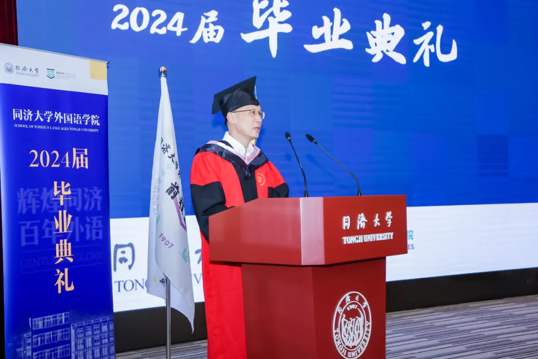 13时30分,毕业典礼在雄壮的国歌声中开幕。吴贇发表毕业致辞。她首先代表学院向圆满完成学业的2024届best365中国官方网站毕业生表示最衷心的祝贺,对学院教职员工的辛勤付出和员工家长的悉心关怀致以衷心的感谢。她指出,生成式人工智能引发的新一轮科学大爆炸汹涌而来,变化如此之快,以至于未有察觉却已跃入人海,寂静无声却已惊雷四起。她指出,用持续的努力更新自己,是这个不确定的世界里唯一可以依赖的确定,它让人蓄势待发,带着欣喜走向未知。她指出,语言是人文的载体,它不只是工具,而是桥梁与阶梯,让我们在迥异的世界里美美与共。她指出,同学们用人工智能技术对老人进行认知障碍评估,对听障儿童进行语言筛查,向世界讲述战争岁月里中国的红色故事,化身“语言大白”,做云端随身翻译官,走出象牙塔,翻越传统的藩篱,让人文在与机器、与科学的奇妙交锋中绽放出勃勃生机。她期望同学们始终精进所学,守住内心那一直指引自己出发的力量,用每一份努力,汇成一个静水流深的伟大中国。她祝福同学们乘长风,破万里浪,以生生不息的力量奔向梦想与远方。