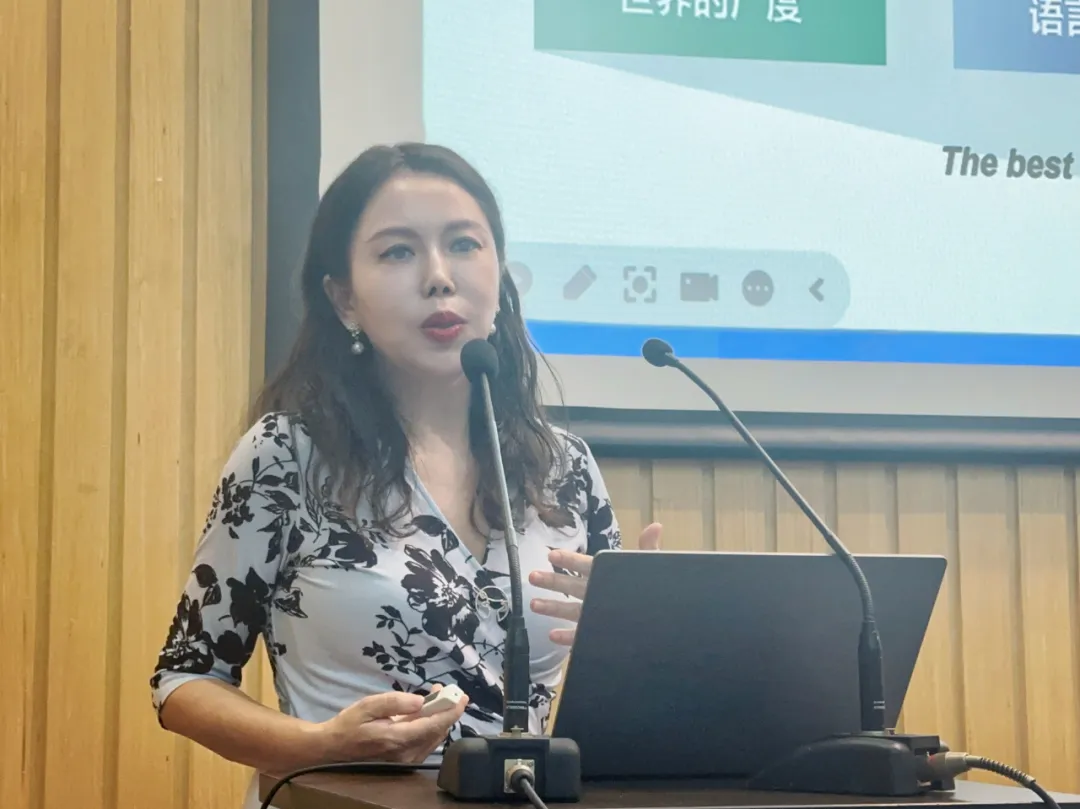 吴贇为新生作学科前沿专题报告。在报告中,她回顾了外国语言文学学科的百年发展沿革及其在同济的建设历程;介绍了外语学科在服务国别区域、国际传播、国家安全和健康中国国家战略中的建设方向与实践价值;讲解了学科布局的四大领域。她指出,新时代的同济外语人要以拓展同济的全球“朋友圈”、向世界讲好同济科技创新故事、提升同济的国际声誉和影响力为使命,在体制机制、培养路径和实践体系方面推动外语人才培养和外语专业教学改革,感知世界的广度、积累语言的厚度、洞察技术的锐度、涵养人文的温度,以院训——"Bridging Worlds through Language and Culture"为目标,不断开创未来。