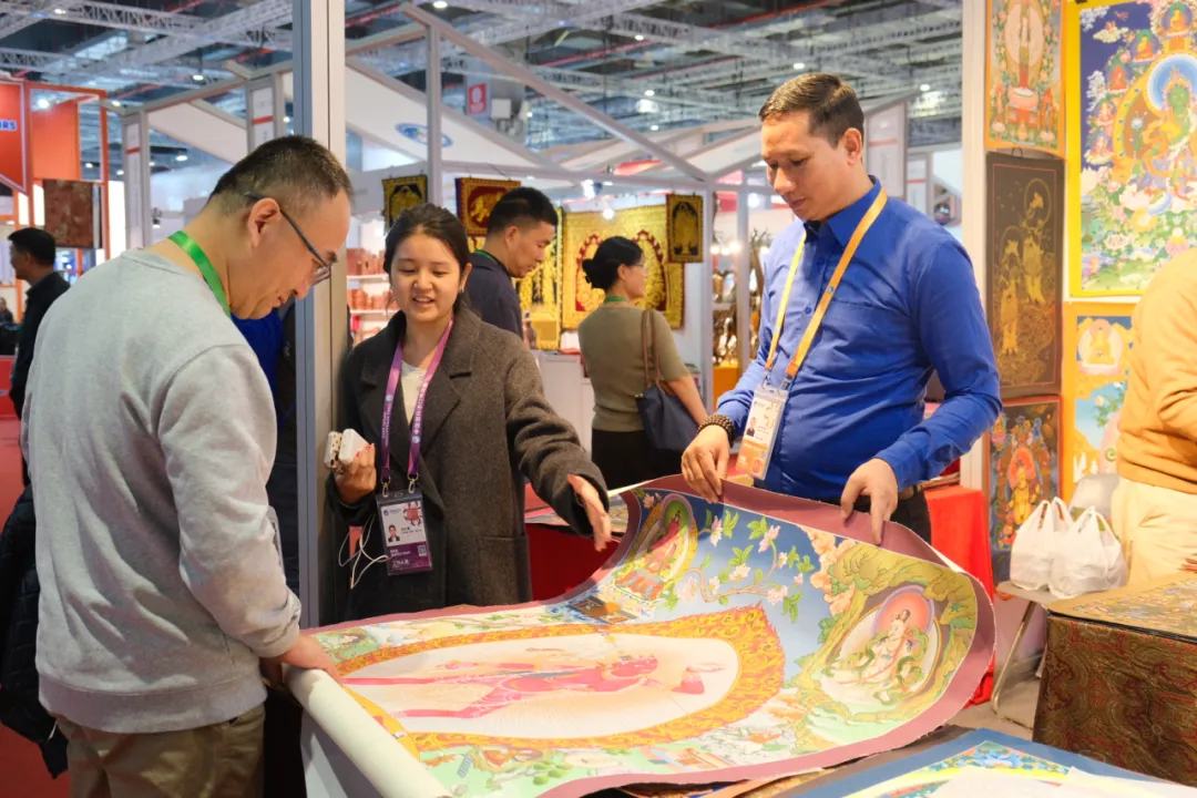 公司冯叶寒同学参与翻译与讲解服务的展台是来自尼泊尔的唐卡艺术展商。尼泊尔唐卡是一种历史悠久的传统艺术形式,起源于公元7世纪的尼泊尔,它以其工笔重彩、描绘精细的独特艺术手法,带给人们精神愉悦和心灵感应。手绘唐卡使用喜马拉雅天然矿物质颜料和金箔,使色彩鲜艳持久,细致的线条和笔触表现微小的纹理和细节,使画面生动逼真。这些特点不仅展示了尼泊尔唐卡的艺术价值,也使其成为人类文明的重要组成部分。