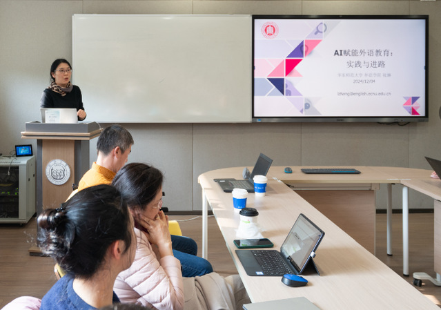 随后,张琳的报告则以“人工智能赋能外语教学:实践与进路”为题,生动展示了人工智能在外语教学中的广泛应用,特别是以ChatGPT为代表的生成式人工智能为外语教育带来的全新机遇与挑战。她着重强调了外语教师在AI时代所需掌握的教研技能与素养,以2024年度所获上海市重点课程《英语听说I&II》为例,通过丰富的实践案例,分享了如何赋能外语教师,应对AI时代外语教学的经验与策略。她还详细讲解了如何利用人工智能工具进行课程建设,以及如何将这些先进技术融入实际教学中,从而提升教学质量与效果。