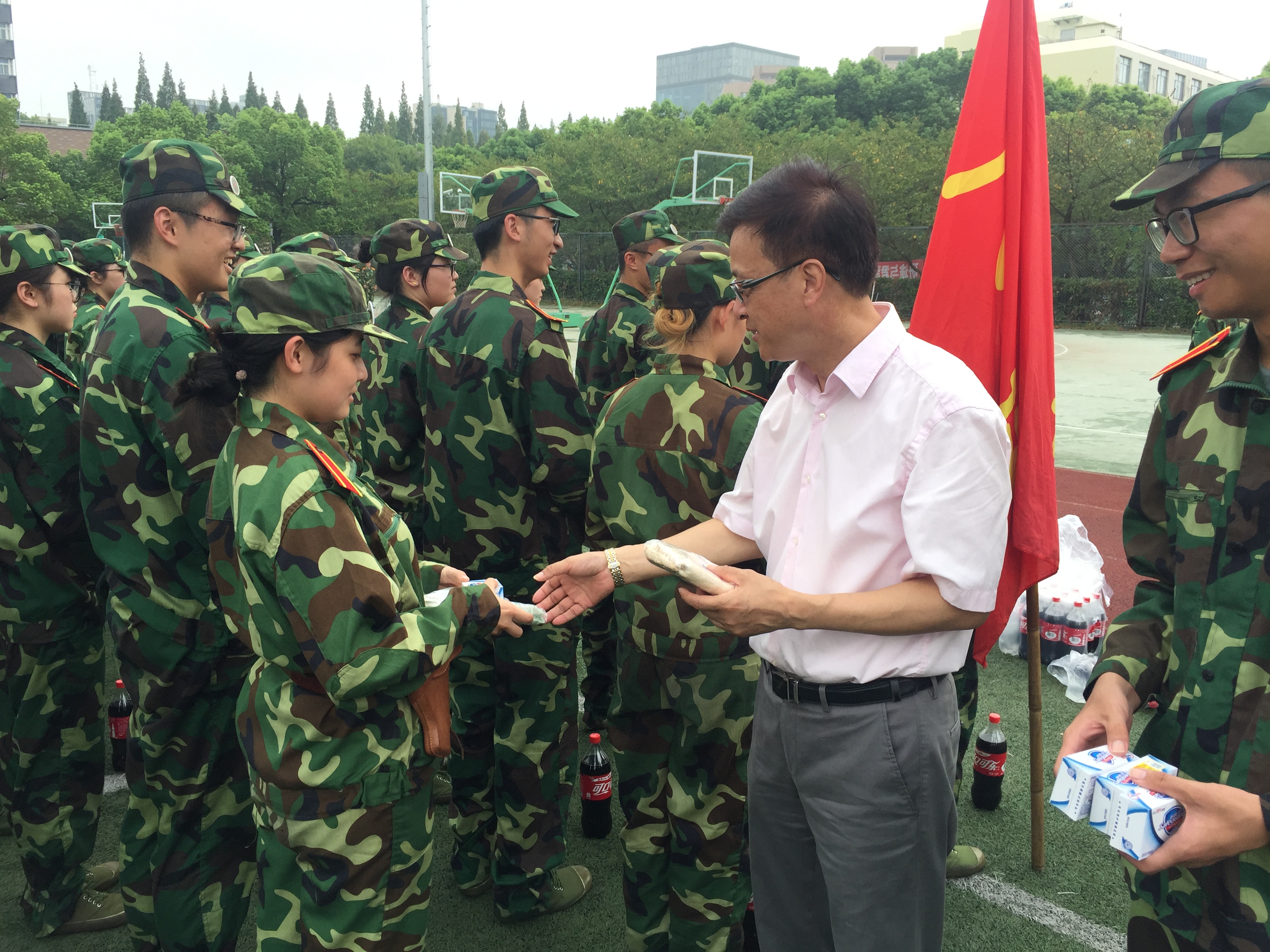随后,参训员工向学院领导演练了战术动作及阅兵分列式口号。同学们斗志昂扬,动作整齐,口号响亮,充分展示了同济学子青春向上、充满正能量的阳光形象。李立贵、吴贇对同学们的训练成果表示肯定,并向同学们分发了慰问品。