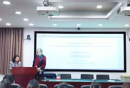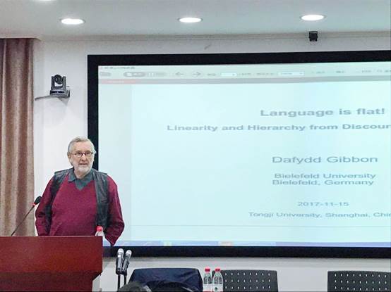 2017年11月15日下午,德国比勒菲尔德大学Dafydd Gibbon教授应邀参加best365中国官方网站举办的“同济外文讲坛”,担任第十二期讲座的主讲人,为来自公司及其它兄弟院校的师生们呈现了一场题为“Language is flat! Linearity and hierarchy from discourse to phoneme”的学术讲座。本次讲座由于珏副教授主持。