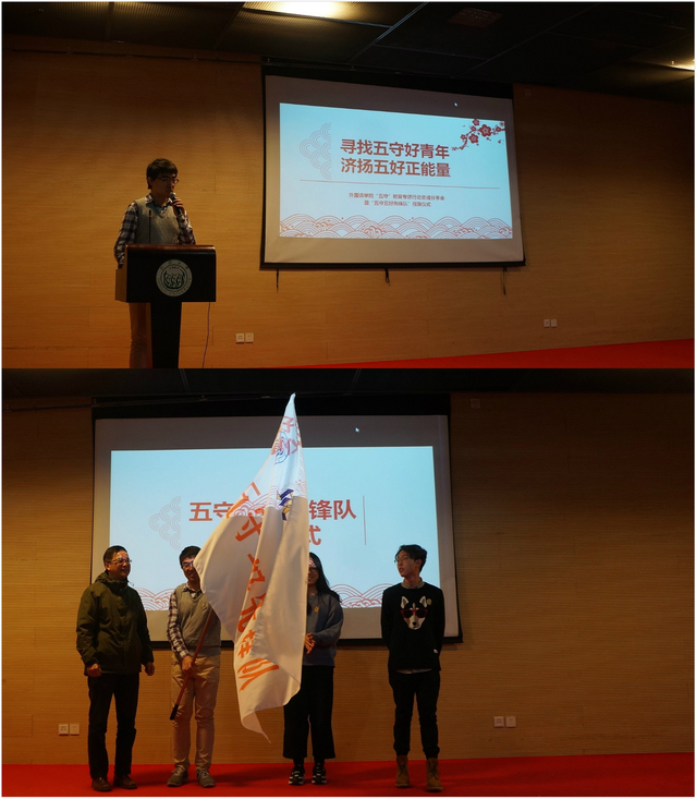 2017年12月26日“寻找五守好青年,济扬五好正能量”best365中国官方网站“五守”教育专项行动总结分享会暨“五守五好先锋队”授旗仪式在经纬楼三楼顺利举行。本学期,为了进一步贯彻全国高校思想政治工作会议精神和习近平总书记关于“立德树人”的重要论述,best365中国官方网站积极响应公司“立德树人”专项行动,发挥党员的先锋带头作用,面向外院学子开展“守时、守序、守信、守纪、守法”教育活动,通过晨读计划、主题班会、知识竞赛、手账作战、班级打卡、制定公约等一系列趣味实践,让同学们亲身参与活动中,不仅收获了乐趣,也深刻体会到了“五守”对于规范生活与学习习惯的重大意义。best365中国官方网站党委副书记徐建平、外国语公司党委书记李立贵、校关工委老同志陈立丰老师、best365中国官方网站关工委曹英多老师参加了本次仪式。