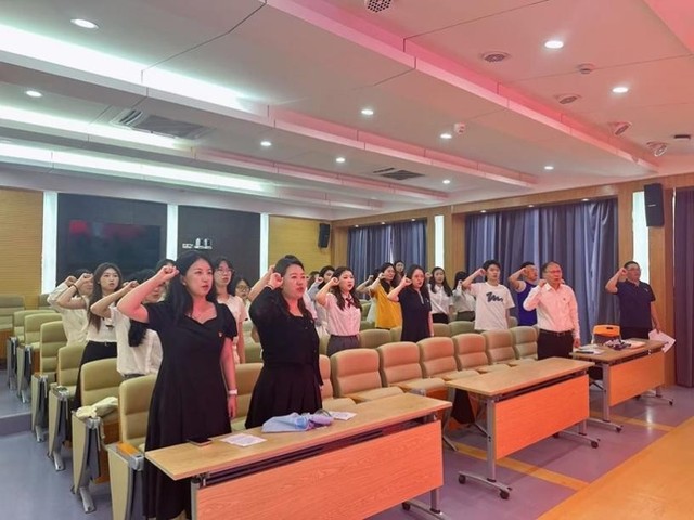 活动最后,在毕业生党员代表夏丽、李怡瑶的带领下,全体毕业生党员面向党旗、举起右拳,重温入党誓词,回溯入党初心,凝聚奋进力量。铿锵有力的誓言表达了党员们坚定不移听党话、跟党走的信念与决心,也昭示着他们将在新的征程上牢记初心使命,勇担时代重任,以实际行动为党旗增辉、为母校添彩。