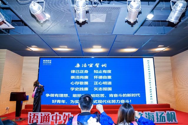 李怡瑶作为本科毕业生代表发言。她表示,在学院求学的经历让自己明白,外语人的价值,在于用专业能力消除隔阂,用文化自信传递真实立体的中国。她呼吁毕业生永葆学习热情,坚守家国情怀,勇担社会责任,在各自岗位上发光发热。她代表毕业生郑重承诺:不负母校培养,努力在实现中华民族伟大复兴中国梦的征程中,贡献外语人的智慧和力量。