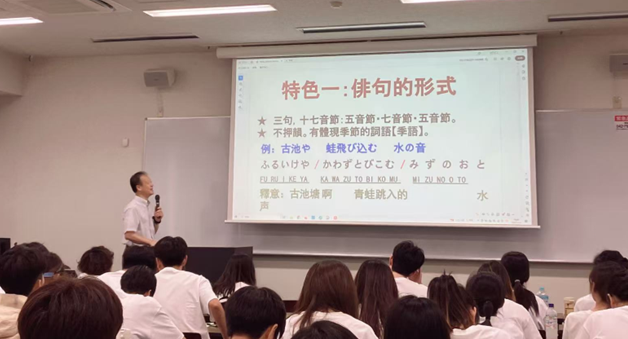 讲座中张教授列举松尾芭蕉的俳句经典:“古池や 蛙飛び込む 水の音”(闲寂古池旁,蛙入水中央,悄然一声响 )。在这简短十七音里,古池的静谧、青蛙跃入的动态、水响的清脆,瞬间勾勒出一幅动静相宜的画面。无过多修饰,却将自然的微妙变化与刹那间的生命律动精准捕捉,让我深刻领悟到俳句崇尚简洁、含蓄、雅淡的艺术风格。