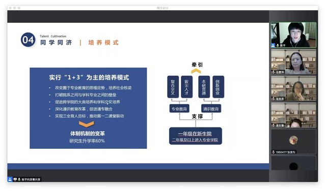 接下来的朋辈分享环节中,来自本科2018级的张涤为同学(原成都外国语学校保送生)和陈彦琪同学(原济南外国语学校保送生)分别向大家介绍了自己保送后的主辅修学习情况、在同济的日常学习体验及生活感触等。来自本科2020级的芮欣祺同学(原上海浦东外国语学校保送生)与大家分享了自己在第一学年大类培养中的心得体会和保送考试的内容及注意事项。