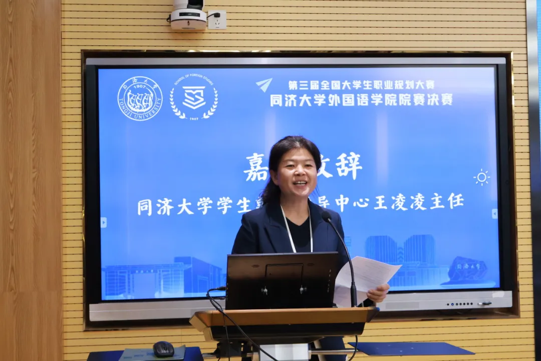 在决赛现场,王凌凌主任为比赛致辞。她充分肯定外院的赛事筹备工作,并对赛事成功举办表示热烈祝贺,对参赛选手表达美好祝愿。她希望同学们在国家发展战略引领下,积极适应大变局,精准把握新机遇,多维度、长周期谋划未来职业发展的方向。