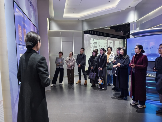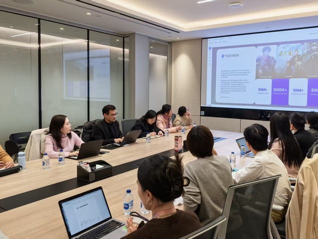 调研团队首先参观了阅文集团展厅,了解其发展历程、核心业务与网络文学出海成果。作为国内数字阅读与文学IP培育的领军企业,阅文集团汇聚大量优质作家与作品,并通过多语种翻译、海外平台运营等方式,持续推动中国网络文学走向世界。参访教师对数字内容生态与出海实践有了直观认识,并就网络文学翻译、跨文化传播策略及数字技术应用等话题,与现场人员进行了交流。