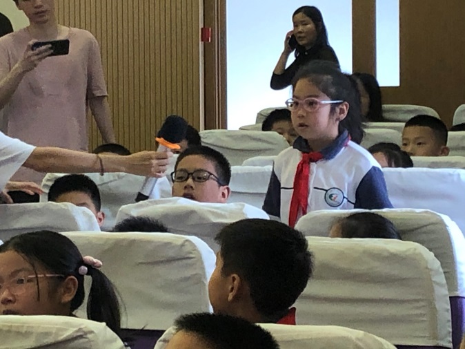 金琦同学最后更是通过向同学们介绍“红色济译”团队是如何通过发现红色场馆中的翻译小问题,通过思考、探索,分析问题,和团队成员一起团结协作,最后一同解决问题这样一个过程,向孩子们传递了“发现问题、分析问题、解决问题”的科学探索思路。她还向大家介绍了团队的具体研究成果,与大家探讨了科学研究报告的意义。