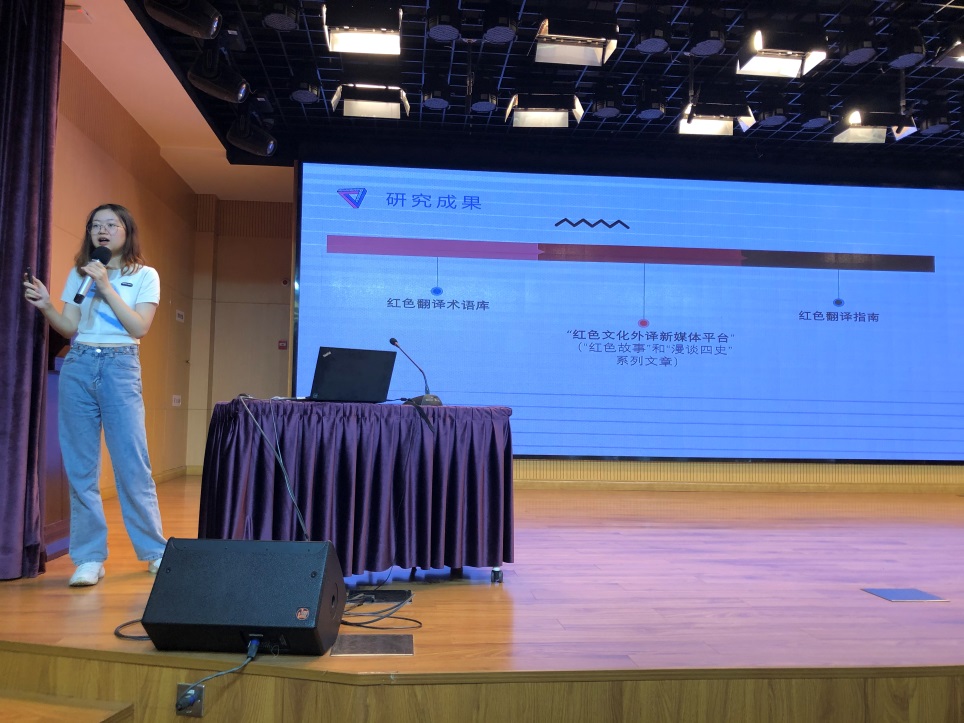 台上,邓文君同学结合孩子们平时佩戴的红领巾,介绍了红领巾在翻译成大家耳熟能详的“Red Scarf”中所遇到的一些问题,从而介绍了红领巾的历史与它所承载的吃苦不畏万难的精神,由此向大家传达了“向世界讲好中国的红色故事”这样一种使命感;而这也正是“红色济译”团队成立的初心。台下的同学们积极踊跃地举手,参与互动,一次次地发言展现出他们对于翻译、对于红领巾背后的意义更加深刻的理解。