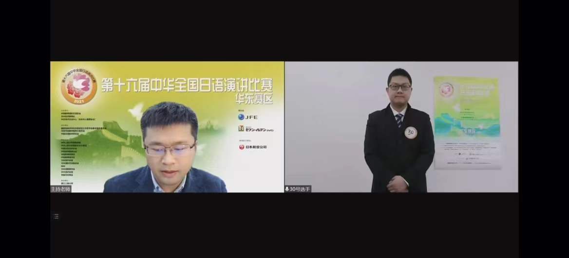 1月8日,由中国教育国际交流协会、日本经济新闻社、中日学术交流中心(日本华人教授会议)合作主办,教育部高等学校外国语言文学类专业教学指导委员会日语专业教学指导分委员会、中国日语教学研究会协办的“第十六届中华全国日语演讲比赛(华东赛区)”以线上线下相结合的形式隆重举办。该项赛事是目前国内最具影响力的日语演讲赛事,来自华东地区上海、浙江、江苏、江西4省市32所高校的32位选手在线上通过直播同台竞技。