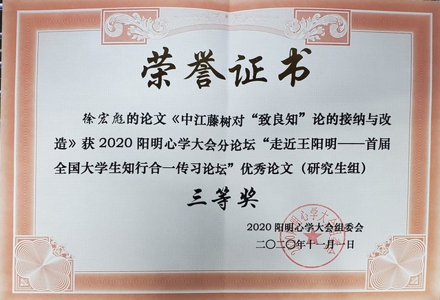 11月1日,大会召开了“走近王阳明——首届全国老员工王阳明知行合一传习论坛”,通过第一轮遴选后,共有来自全国各大高校的96名老员工参会。公司日语系硕士一年级研究生徐宏彪,在导师陈毅立的悉心指导下,撰写了论文“中江藤树对‘致良知’论的接纳与改造”(全文约8500字),荣获研究生组优秀论文三等奖,论文被收入《王阳明知行合一传习论坛论文集》。