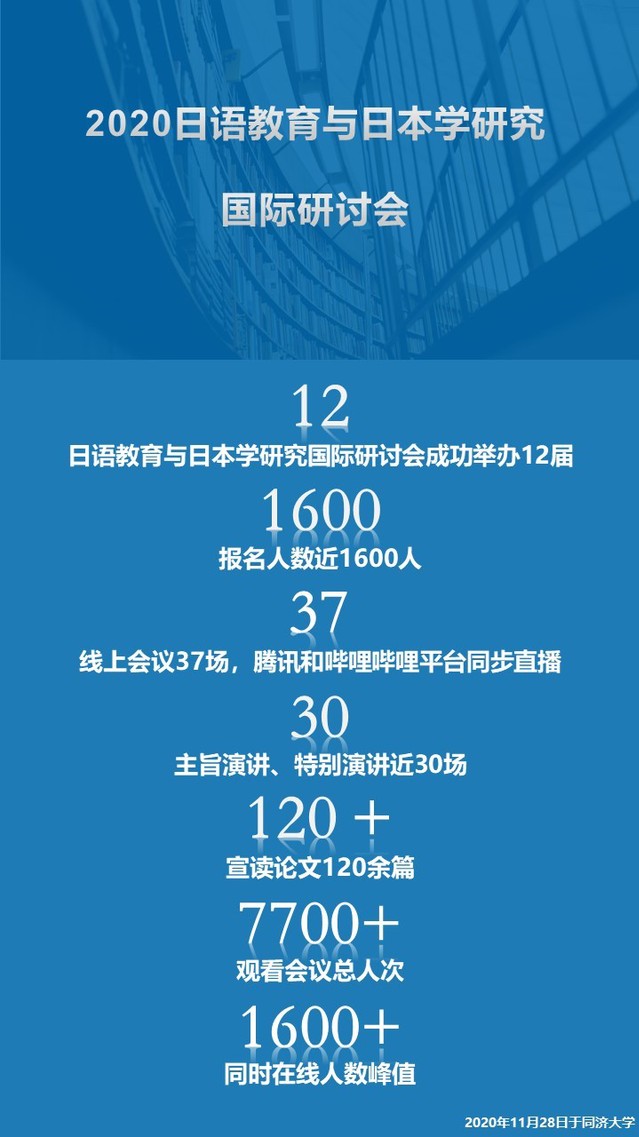 2020年11月28日,由教育部正式批准,教育部高等学校教学指导委员会日语分委员会、中国日语教学研究会上海分会主办、best365中国官方网站承办的“2020日语教育与日本学研究国际研讨会”在云端举行,并通过腾讯会议和哔哩哔哩平台同步直播。本次会议报名参会人数近1600人,其中研究生报名参会人数超过200人,是迄今为止规模最大的日语教育与日本学研究国际盛会。