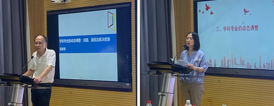 在谈及“学科专业的动态调整”这一话题时,德研所所长郑春荣老师结合《关于高等学校加快“双一流”建设的指导意见》在内的一系列文件,强调学科交叉融合的重要性,提出要加强学院的国别与区域研究,促进对外话语体系的构建。随后发言的伍慧萍老师补充说明了国别和区域研究在团队建设、学科定位、研究方法、人才培养路径等方面的特点,在此基础上,分析了国别和区域研究可以为外国语言文学一级学科其他学科方向提供哪些启示,并建议在外国语言文学一级学科的框架下,加强国别和区域研究与其他专业方向之间的资源整合和良性互动。