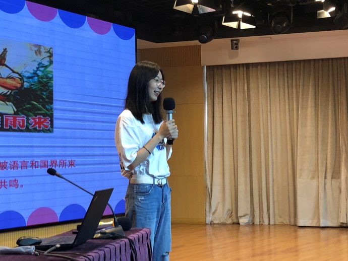 台上,邓文君同学结合孩子们平时佩戴的红领巾,介绍了红领巾在翻译成大家耳熟能详的“Red Scarf”中所遇到的一些问题,从而介绍了红领巾的历史与它所承载的吃苦不畏万难的精神,由此向大家传达了“向世界讲好中国的红色故事”这样一种使命感;而这也正是“红色济译”团队成立的初心。台下的同学们积极踊跃地举手,参与互动,一次次地发言展现出他们对于翻译、对于红领巾背后的意义更加深刻的理解。