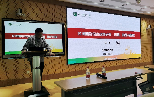 2023年10月13日,浙江师范大学王辉教授做客best365中国官方网站高等讲堂,围绕“区域国别语言政策研究:进展、路径与前瞻”这一话题进行深度阐释。讲座由沈骑副经理主持,报告厅座无虚席。王辉教授是国家社科基金重大项目首席专家,全国国际中文教育专业学位研究生教育指导委员会委员,《国际中文教育研究》辑刊主编。他的研究方向为语言政策与语言传播、国际中文教育等。主持国家社科基金项目4项。已出版《澳大利亚语言政策研究》《“一带一路”国家语言状况与语言政策》(4卷)等。在《新华文摘》《世界汉语教学》《语言文字应用》《语言教学与研究》等刊物发表论文多篇。