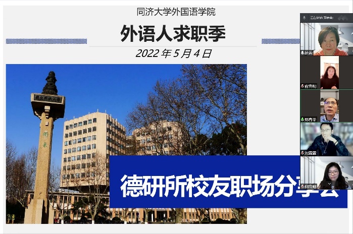 2022年5月4日晚间,德国研究所举办了面向毕业生的员工职场分享会。由于疫情原因,本次分享会在线上进行,邀请了6名就职于各行各业的德研所员工分享他们的职场生涯和体验,来自德研所和德语系的30多名研究生在线参会交流。