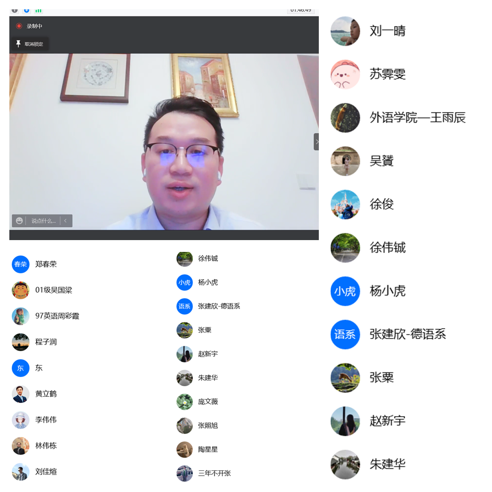 交流会上,各位院友理事也畅所欲言,围绕学院发展和院友会建设“建言献策”。院友会顾问朱建华教授提出对学院教学、科研方面的建议,希望学院未来在教材建设、“金课”打造方面有所突破;院友会副会长、2001级日语系员工吴国梁分享了他作为企业经营者对社会行业调整、人才市场供需和员工就业观的观察与分析,从企业“用人”的角度提出了他对员工职业生涯规划和“价值观”教育的建议;院友会副会长、2000级英语系员工林伟栋分享了他从大学毕业到如今成为企业财务副总裁的“跨行”经历,建议同学们尽早选定职业方向,培养学科交叉的多维素养,学院也可邀请广大员工做同学们的“职业导师”;院友会副会长、2008级德语系员工苏霁雯、理事陆锦燕、周彩霞、文东等员工就当前就业招聘、院友联动互通、助力学弟妹成长等话题进行了深入的讨论,各位代表分别结合自己的职场经历提供了许多建设性的意见。
